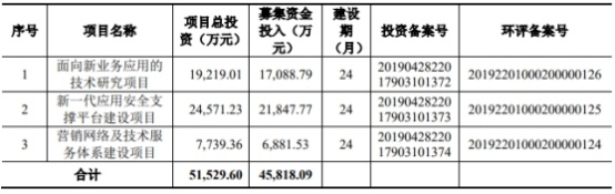 吉大正元发行新股募集资金总额为50,827.70万元,扣除发行费用后,募集资金净额为45,818.09万元。吉大正元于2020年12月14日披露的招股说明书显示,公司募集资金拟用于面向新业务应用的技术研究项目、新一代应用安全支撑平台建设项目、营销网络及技术服务体系建设项目。