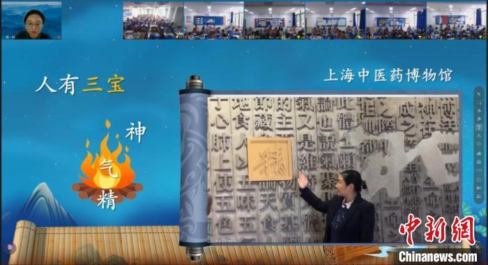 上海中医药博物馆副研究馆员全瑾为学生们解释中医基础理论中“精、气、神”的含义。跟随视频镜头,学生们远程参观上海中医药博物馆一楼大厅“精、气、神”浮雕,了解到“精、气、神”在中医学里被视为人体“三宝”,其中,“气”在人体内按照一定规律运行,经络是“气”的通道,而针灸正是通过刺激经络中的“车站”——穴位(学名“腧穴”)来发挥医疗作用的。