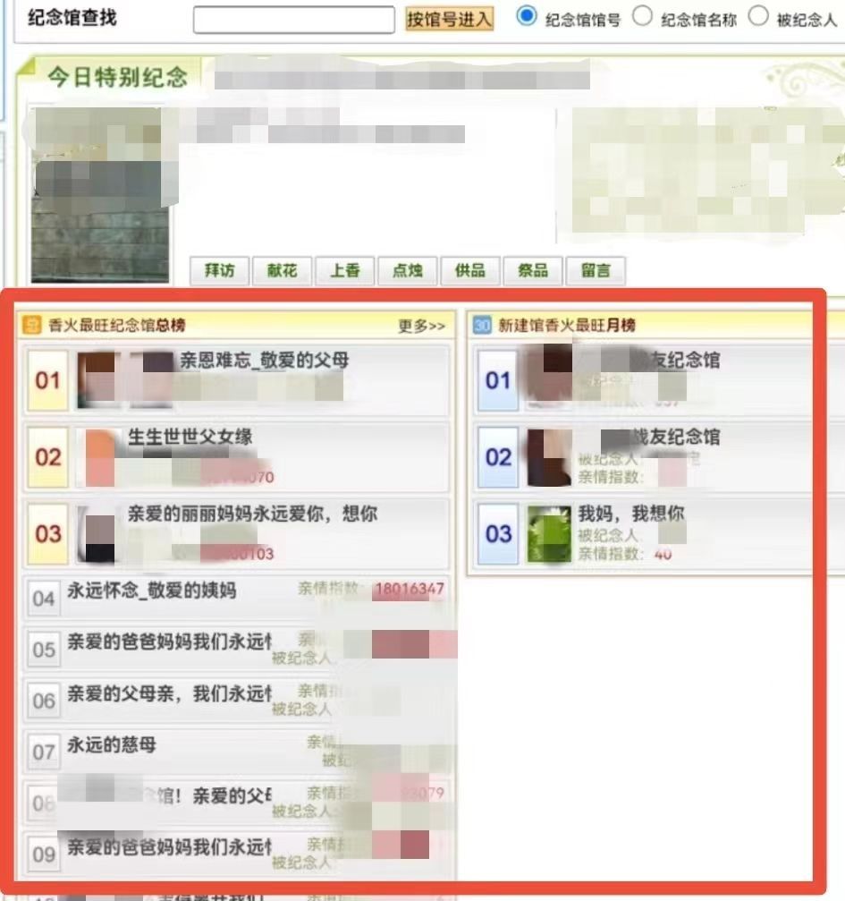 但记者也发现“活人网墓”“网络孝子香火排行榜”“个人信息泄露”等问题仍未绝迹。