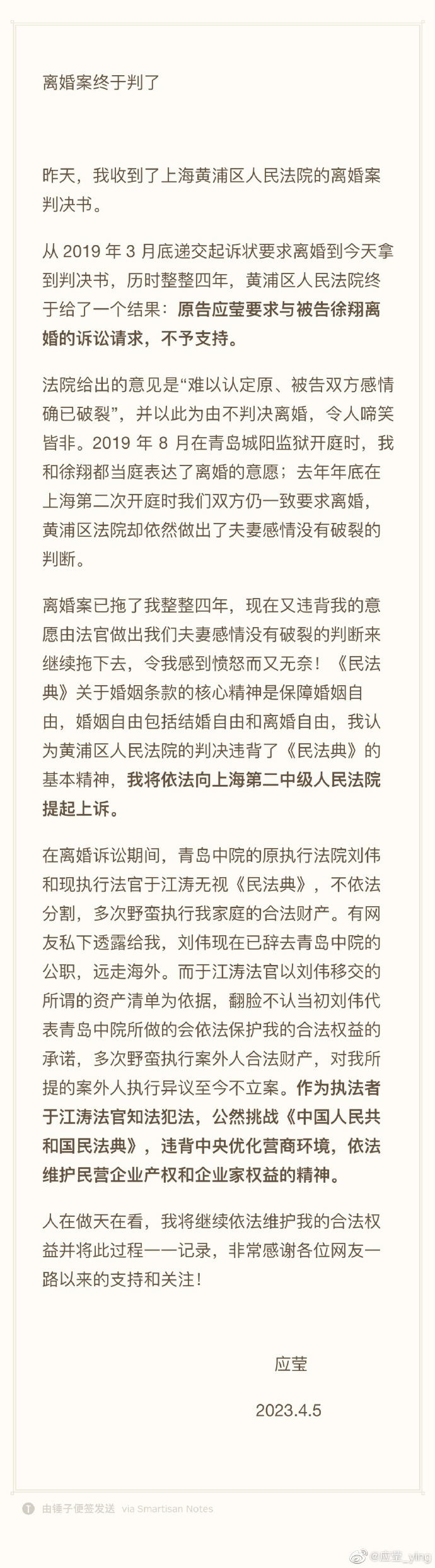 4月5日,应荧在微博发文称,昨天,我收到了上海黄浦区人民法院的离婚案判决书。从2019年3月底递交起诉状要求离婚到今天拿到判决书,历时整整四年,黄浦区人民法院终于给了一个结果:原告应莹要求与被告徐翔离婚的诉讼请求,不予支持。