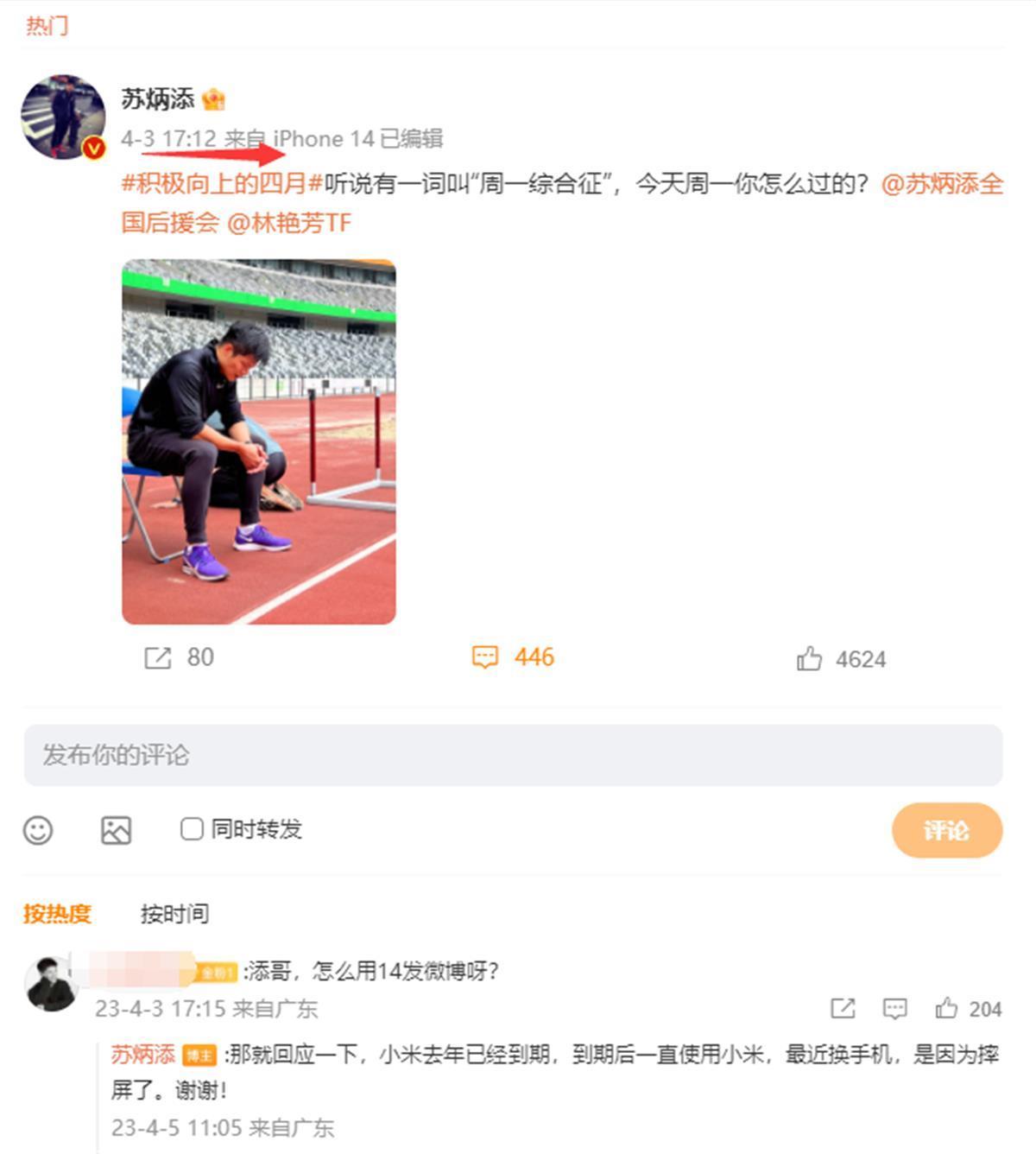 近日,苏炳添使用了iPhone 14发微博引发网友质疑,苏炳添回应称,与小米的代言合约去年已经到期,到期后一直使用小米,最近换手机,是因为摔屏了。谢谢!
