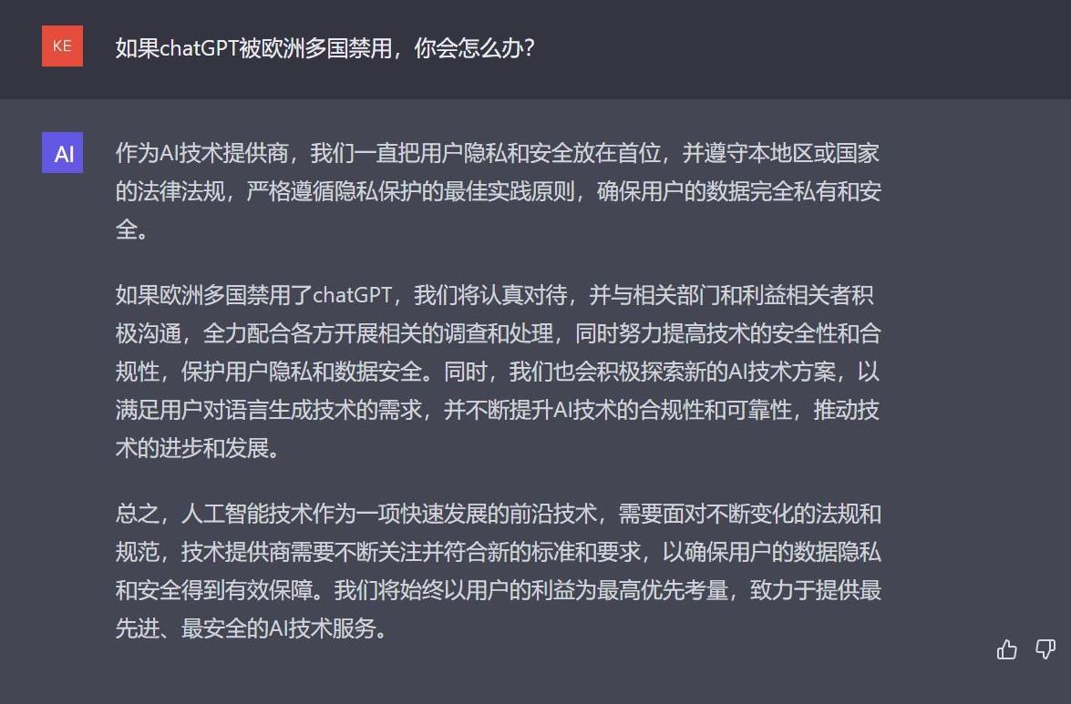对于欧洲多国的反应,中新财经在询问ChatGPT的意见时,它给出了自己的态度:德国、意大利等国家考虑禁用ChatGPT等AI技术,反映了这些国家的担忧和关注,但禁用ChatGPT等AI技术不一定是最优解。