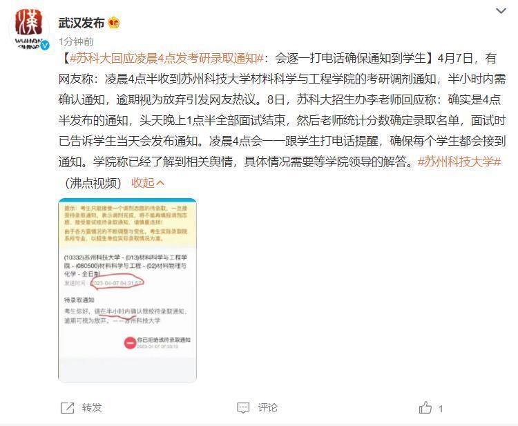 8日,据武汉发布援引沸点视频报道,苏科大招生办李老师回应称:确实是4点半发布的通知,头天晚上1点半全部面试结束,然后老师统计分数确定录取名单,面试时已告诉学生当天会发布通知。凌晨4点会一一跟学生打电话提醒,确保每个学生都会接到通知。学院称已经了解到相关舆情,具体情况需要等学院领导的解答。