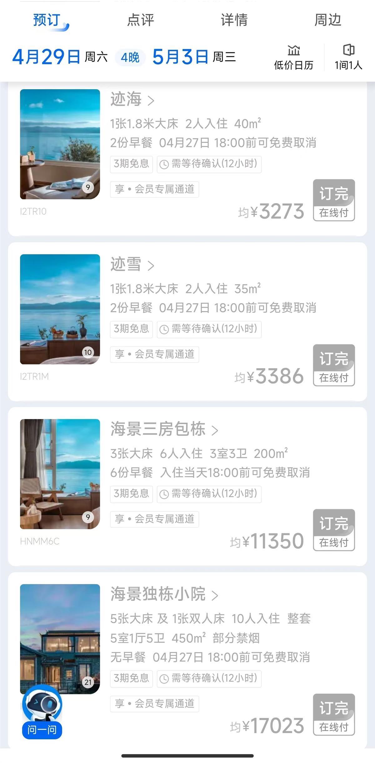 4月8日上午,极目新闻记者致电大理洱海附近的某海景酒店,工作人员表示,目前可容10人入住的海景独栋小院价格为4000元左右,五一期间的价格则在10000元左右,“五一的价格比平时会贵一些,目前海景独栋小院只有5月1日当天有房,其他时间都已被订出。”该工作人员表示,五一假期期间,酒店的其他房型也都已经被订出,“今年大理的游客一直都比较多,无论是独立院子还是普通民宿,价格都有所上涨,今年我们店的入住率比去年也高一些。 ”
