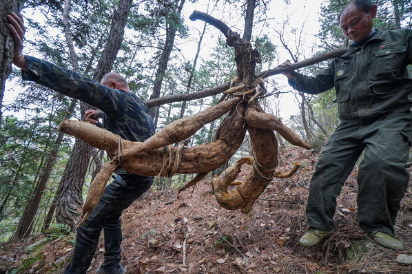 左文亮(右)与同伴将挖好的葛根抬下山(支点财经记者 陈勇 摄)