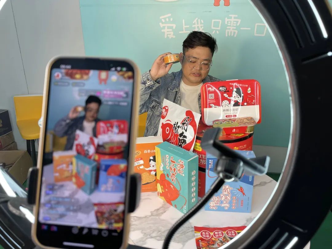 生产还在准备,但销售从未停歇。偌大的展厅内,麻辣虾、蒜蓉虾、十三香、麻辣虾尾等预制菜产品琳琅满目,工作人员一边加热,一边直播。