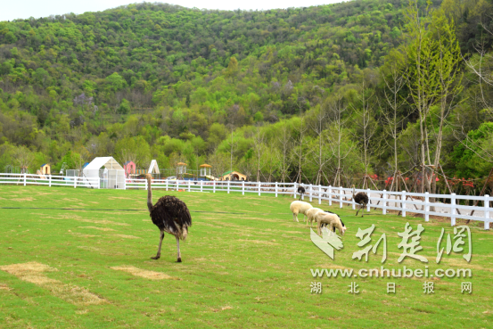 大草坪上,写着“把童年还给山川和大地”,充满童趣的风车造型和卡丁车已就位,远处山坡上绿树环绕,一条索道已搭建好,沿索道上山可看到“天空之境”。在动物园区,数只鸵鸟和羊群正在悠闲地放养,游客可近距离体验给动物喂草,后期还将增加香猪等深受孩童喜爱的动物。