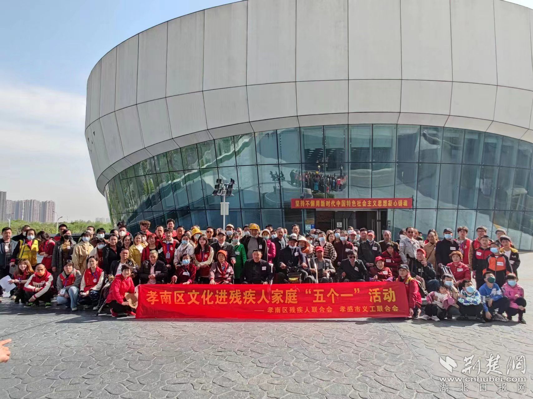 荆楚网(湖北日报网)讯 (通讯员邓双平、江妍妮)为丰富残疾人文化生活,满足残疾人精神文化需求,帮助更多残疾人享受文化服务。2023年4月9日,孝南区残疾人联合会、孝感市义工联合会联合开展文化进残疾人家庭“五个一”活动(即读一本书、看一次电影、游一次园、参观一次展览、参加一次文化活动), 有来自孝南区的90名残疾人及家属一同参加了参观展览、读书、观影活动。