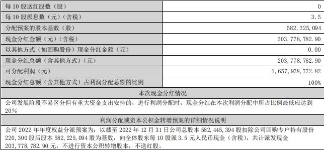 公司2022年年度权益分派预案为:以截至2022年12月31日公司总股本5.82亿股扣除公司回购专户持有股份220300股后股本5.82亿股为基数,向全体股东每10股派3.5元人民币现金(含税),共计派发现金2.04亿元,不进行资本公积转增股本,不送红股。
