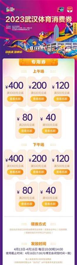 专用券券面金额分别为400元、200元、120元、80元和40元,抢领后即刻生效,核销门槛为2.5倍,专用券仅限于消费者到武汉体育消费博览会现场进行消费使用。