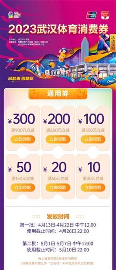 据介绍,领取前,消费者须进入“云闪付”APP完成实名注册,通用券领取时需手机GPS定位在武汉市内,专用券领取时需手机GPS定位在武汉体育消费博览会现场,并现场通过扫描线下二维码领取。