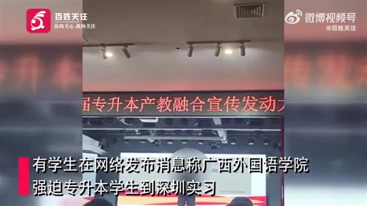 4月12日,广西外国语学院一名学生自曝学校强制要求学前教育专升本的学生到深圳博才教育集团实习,参与流水线工作。视频中,学校在大礼堂召开名为“学前教育2024届专升本产教融合宣传发动大会”的会议,现场学生情绪激动,称自己是来学校学习的,不同意去流水线。广西外国语学院回应,实习属于本科教学培养方案里面的实践实训课程,目的是实现产教融合,学生可以自由选择。(据4月12日百姓关注)