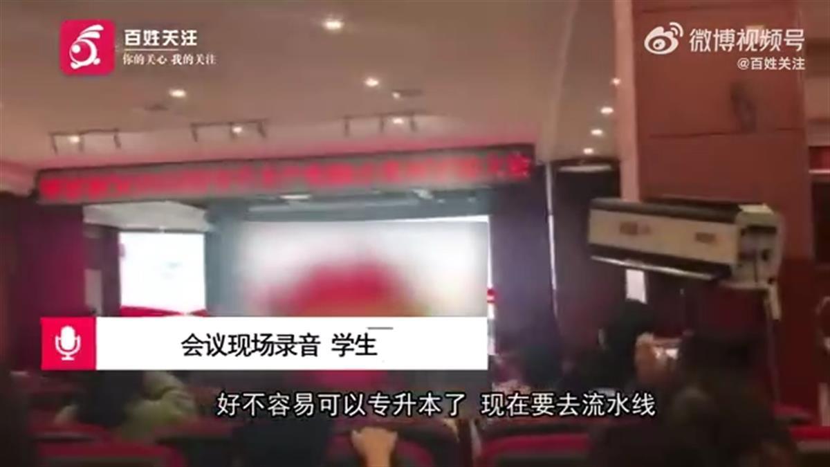 学生曝光的会场视频中,很多学生都对学校的宣传动员感到反感,现场就提出了异议。有学生很气愤地对记者表示:“好不容易专升本了,现在要去流水线,支付了2万多的学费,却被派到一个月2000元的岗位去实习,还不叫实习,美其名曰叫‘学习’。”