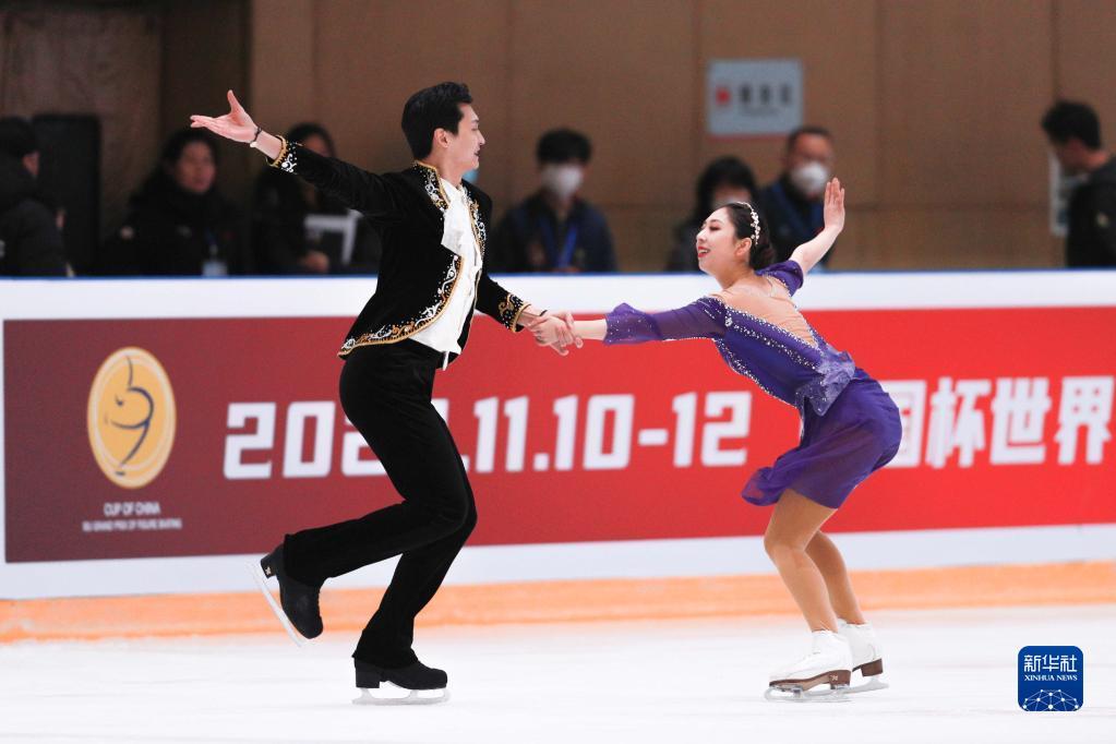 4月13日,哈尔滨市冬季运动项目训练中心选手陈溪梓(右)/邢珈宁在冰舞自由舞比赛中。新华社记者 许雅楠 摄