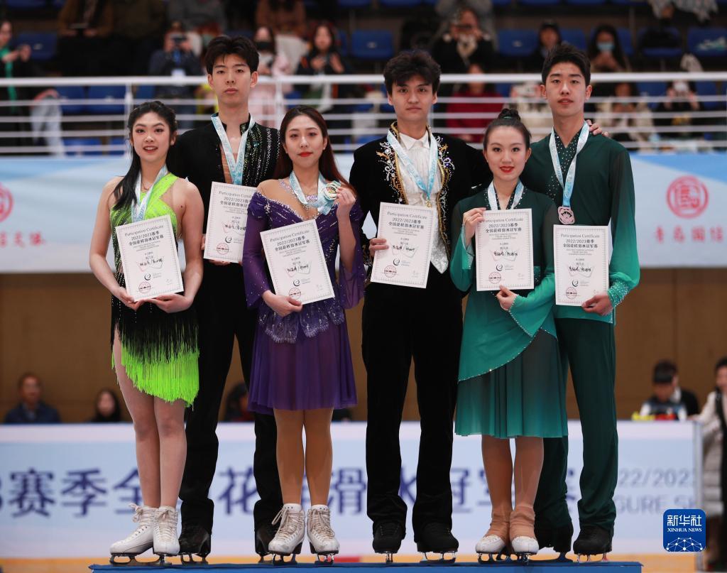 4月13日,冠军哈尔滨市冬季运动项目训练中心选手陈溪梓(左三)/邢珈宁(右三)、亚军吉林省体育局冰上运动管理中心选手林宇飞(左一)/高子健(左二)和季军齐齐哈尔市冬季运动项目中心选手曹路唱(右二)/陈建旭在冰上舞蹈颁奖仪式上。新华社记者 许雅楠 摄