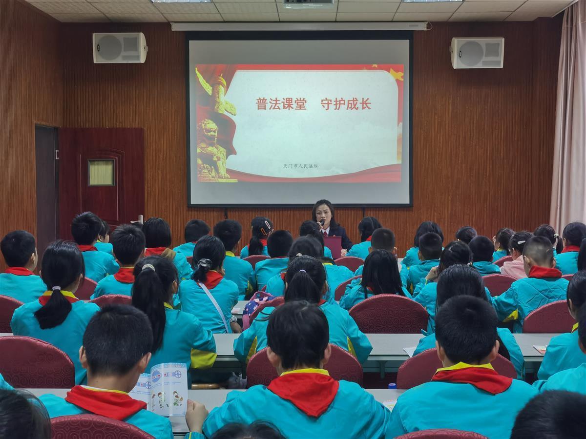 天门法院民一庭干警以“普法课堂、守护成长”为题,围绕防诈骗、禁毒品、反霸凌三个方面,采用故事案例、播放视频等多种形式,为来自九真镇柳河小学的62名学生上了一堂生动的法制安全教育课。