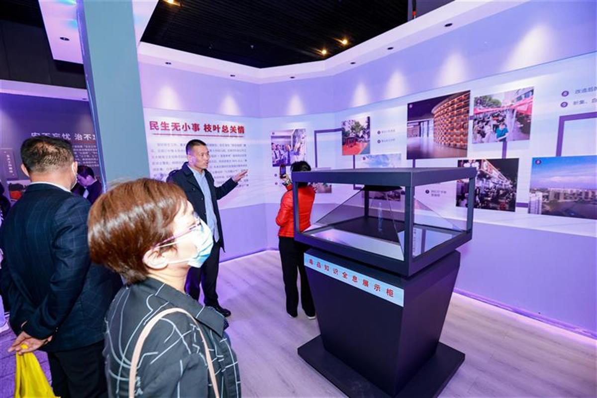 在社会安全厅,参观人员围在全息展示柜周围,认真观看。“原来毒品是这个样子的…”“原来毒品是这样危害身体的…”“高技术设备展示效果真是好”,大家不由感叹。“这套设备非常形象生动,有很强的警示作用。只有了解危害,大家才能自觉抵制毒品。”区委政法委干部叶永红说。