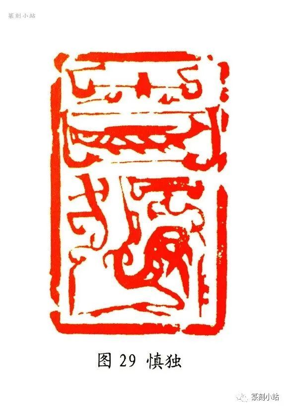 “一种表现性形式也就是一种知觉的或想象的整体,这一整体可以展示出整体内容的各个部分、各个点、甚至各种特征和方位之间的特定关系模式”(《艺术问题》苏珊·朗格),在韩天衡多变的篆法结构中,经过对鸟虫鱼龙等物象造型的特殊处理,使其合理的运用到鸟虫篆印的每个部位和线条刻画上,这种“印化”处理强化了鸟虫结构的图案化和可视性,意在突破前人比较单一的形式表现,更具有强烈的个性和艺术感染力。在对篆法结构中需要突出表现的部分,往往以重笔渲染,夺人眼球,如“慎独”(图二十九)印中,两字各有强烈醒目的鸟虫图式替代某一结构,奇幻生姿,尤其“独”字的虫部,用十分具象的鸟式形态来表现这部分的篆法特征,呈现出的是抽象的篆法结构,有相当的视觉冲击力,被强化了的部首有似与不似的奇妙感觉,势合形离,出神入化,令人心怡。