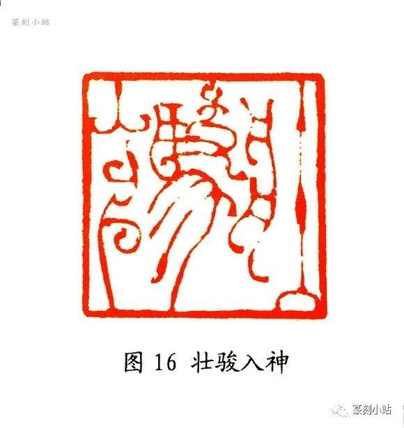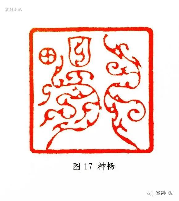 像“自胜者雄”(图十五)印,章法一反平整的均衡构图,摄取了古玺参差错落的特点,“自、者”的结构收缩与“胜、雄”的伸展,营造了大开大合的章法格局,给人以错综感,因参差间的空间形态仍比较清晰,疏密见胜,细细品之,有妙趣横生之感,令人叫绝。“壮驰入神”(图十六)印与“自胜者雄”可谓一脉相承,流转多姿的篆法为空间的开合起到了很好的铺垫,反之也映衬了章法构成的无拘无束,线条虚实互映,强化了章法的空阔与灵秀,常言日有所思,夜有所梦,此印章法之成,是作者“昨夜梦中得此章法,手段似别于往昔者”(边款),读来也是百般滋味。“神畅”(图十七)印均属于这路夸张某个结构或偏旁造型来调节空间虚实的典型作品,整体构图奇妙而焕烂。