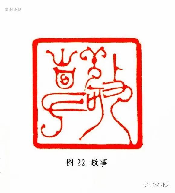 这方“敬事”(图二十二)印,摄取了古玺文字的结构,融入了小篆体势和笔意,兼取收放之态,印中完全泯灭了鸟虫痕迹,却能感觉其意犹存,独具匠心,笔画缭绕中,一派异情别调,舒朗逸游,开鸟虫篆印新面。