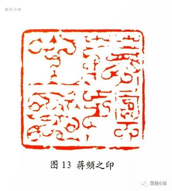 “蒋频之印”(图十三),作者有意突出了“之”与“频”的空间呼应,使原本平整的章法有了错落的看点,“之”之中间横笔的上拉,“频”字步部的左移,看似一提一挪两个简单的动作,却给人留下不凡的印象。