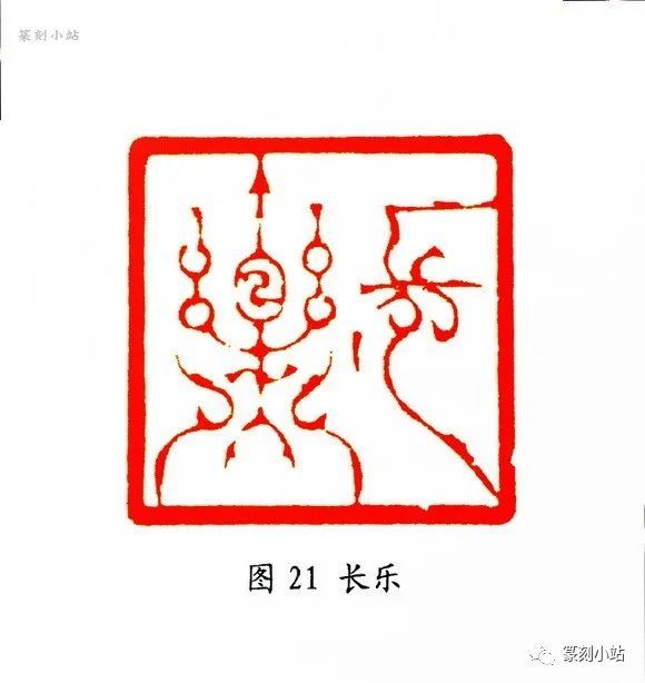 创作于2008年的“与时俱进”(图二十)印,是韩天衡的惬意之作,虽然迄今已过去六年,而作品的出新意识依然值得激赏,其文字意取鸟虫书之源头,即战国兵器剑文上的鸟虫篆,一直侧重于秦汉鸟虫篆印研究的他,对先秦文字同样给予极大的创作兴趣,用来为己所借鉴。此印文字修长娇媚,结构稳健,收放自如,没有大开大合的夸张格局,却有“剑气冲星斗”的气韵,先秦鸟虫书古质妍丽的意韵,通过其秀劲的刀法和流转的线条呈现在我们的视觉中,形与神融,意与古会,这类作品还见之于近年来的创作中,“长乐”(图二十一)印,刻于2010年,从此印的章法来看,两字呈欹正之态,“乐”字中笔上接顶边和下方两垂笔左右触底,呈三角形支撑,以确保字形的稳定,而中宫上收,整体字形郁拔向上,“长”字垂脚以飘逸欹侧的姿态与“乐”字两弧笔产生了笔势上的摇曳呼应,此印鸟虫纹饰很抽象,其妙在于化繁为简,全以富有弹性,劲力外爽的线条处置,别具一格。