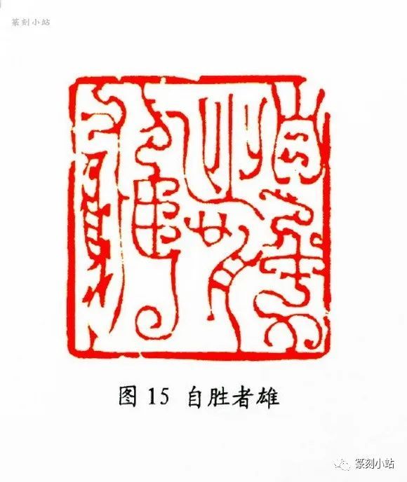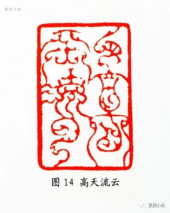“高天流云”(图十四)印中,每个字的篆法都充满了强烈的疏密对比,夸张的结体随着鸟虫花饰的合理配置,将作者的空间意识表现得一览无余。这种处理方式在于强化了篆法的收敛形态与放逸姿势之间的对比,博人眼球,成为其空间构成中的一种常态模式。