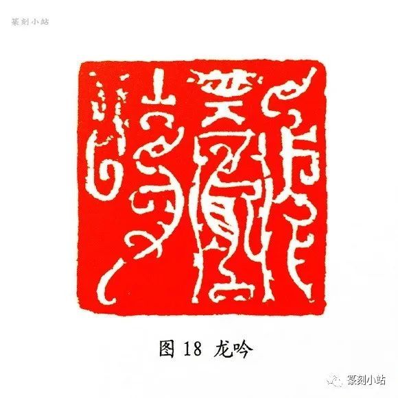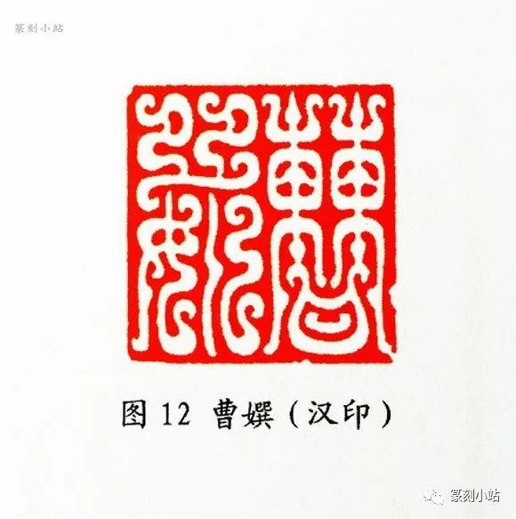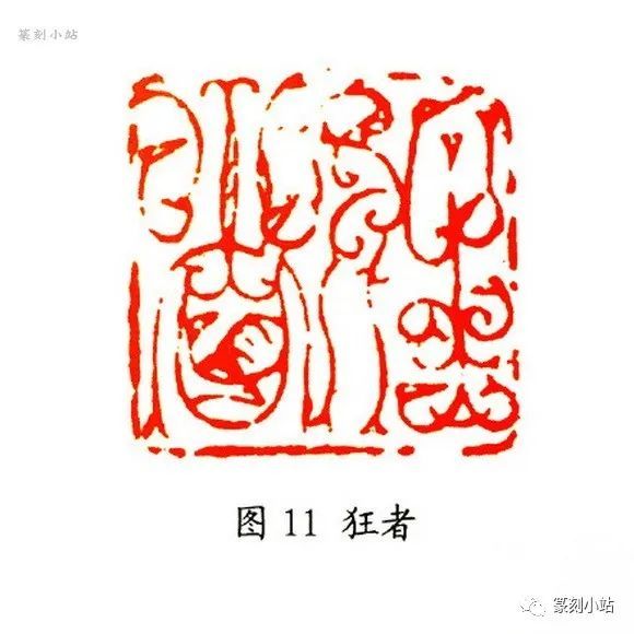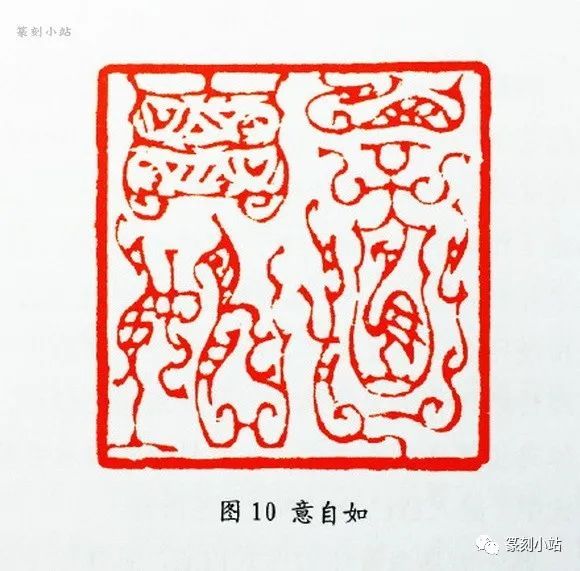 在传统鸟虫篆印里,笔者以为古人在空间处理上,实际并没有给后人留下太多可借鉴、可参照的模式(图十二 ),在以实用为主的目的下,平铺直叙式的章法构成似乎更容易被人接受,若换个角度看,我们不得不叹服晚清赵撝叔在处置印章空间上的大胆和睿智,尽管这是两种不同的形式语言,但理念是相同的。韩天衡以其敏锐的眼光和深度探究传统印章所积累资质,捕捉到了古人和前贤留下的这个空白点,突破了鸟虫篆印既成的章法构成,以错落换空间,以收放换疏密,有效地解决了鸟虫篆印的空间问题,近年来的创作更是夯实了这种表现性构图的恒定性。