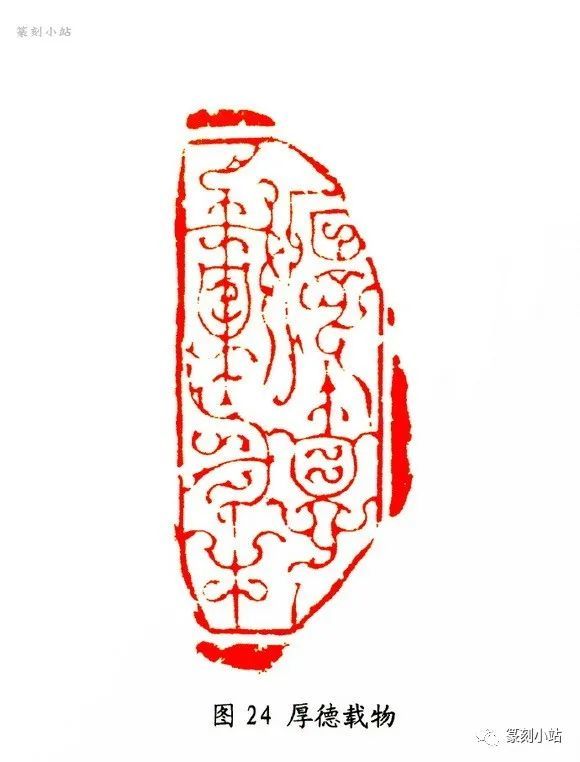 “厚德载物”(图二十四)是仿封泥鸟虫篆印,而作法一反传统封泥印朴拙的形态,施以清丽的线条,鸟虫纹饰只是一种点缀,却能给人以耳目一新。
