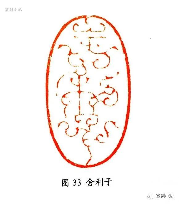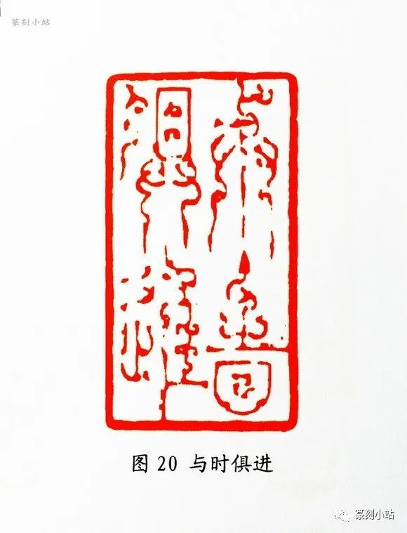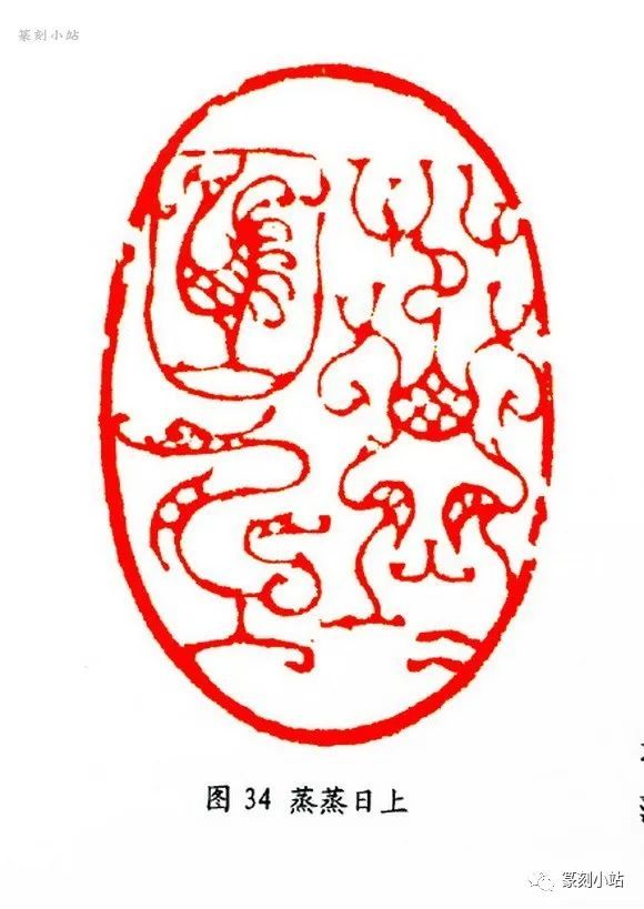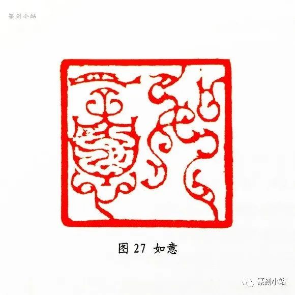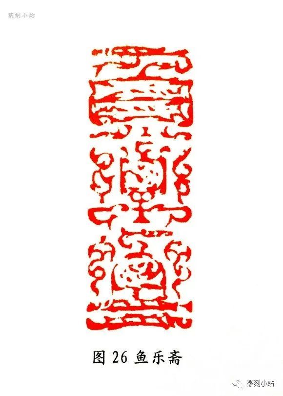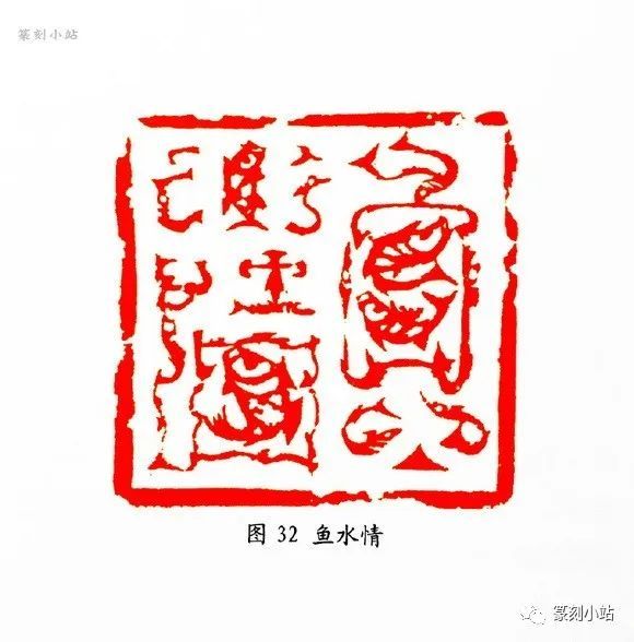 “鱼水情”(图三十二)印,用刀可谓八面出锋,方圆兼施,有顿挫抑扬的线条质感,犀利中仍有一丝柔意,刀法变化随印生发,既依附于线条,又表现出特有的独立性。