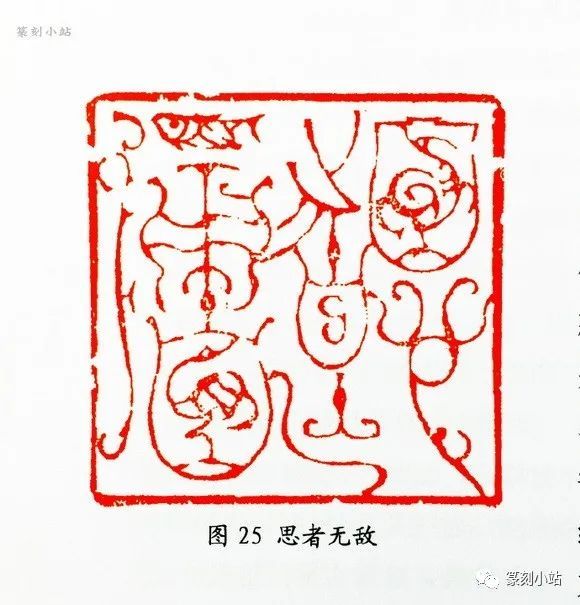 “思者无敌”(图二十五)印,作者“参周中山王诏文”(边款)所刻,疏密停匀的章法中,是线条的“自由”穿插揖让,鸟鱼凤形迹镶嵌其间,字与字之间没有明显的间距分割,结构之间融合一体,将古诏文与鸟虫花饰有机的结合,可谓别出心裁,婉丽流动的线条搭载轻灵抽象的纹饰,勾画出古文字悠远宕逸的奇妙意境。