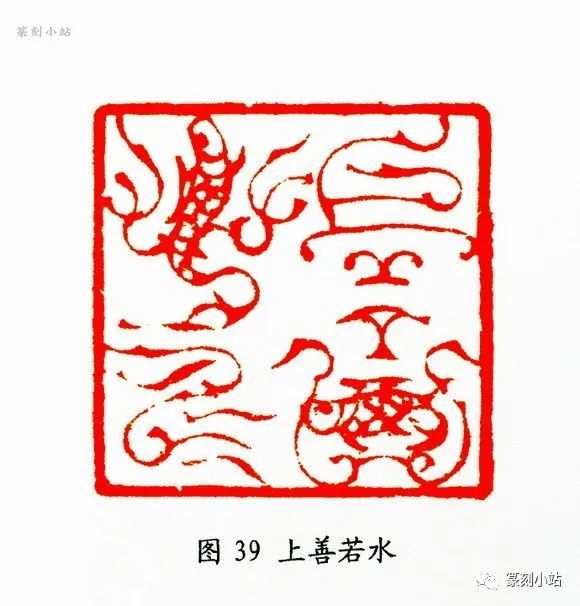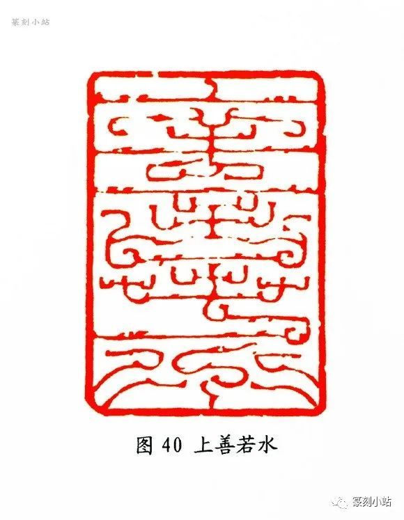“上善若水”(图三十九)印也是一方几经易稿的作品,经从数件样稿中筛选,最后定格于此,印作在大局上抓住了对角繁(鱼形)简(鸟形)呼应的特点,细微处则以新异生动的鸟纹鱼饰来营造篆法的奇妙视觉感官,如“善”字有意简化收窄上部,意在强化“口”之鱼形,“善”字如出一辙,处理得很有意味。整体如“舞凤翔鸾”,有很强的韵律感,劲爽的用刀给予线条响亮的色彩,无一丝多余,其用刀的起承转合中,透露出的是大胆求宏观,细心求耐嚼的艺术品质,此印用完美无瑕来誉之,实不为过。