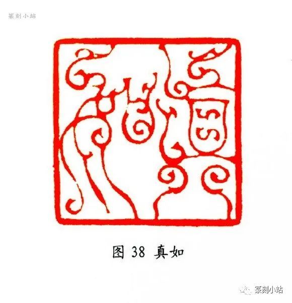 譬如刻“真如”(图三十八)印,在确定形式后,先后易稿十余次,“由章法的虚实到篆法的美饰,乃至到美饰线条间产生叩境和呼应”(韩天衡语),对比数稿,一一斟酌。此印利用鸟虫篆法的灵变和可花饰的优势,结合自身篆法体势,夸张了其结构的疏密,从线条的流转到篆法形态的多姿,再到鸟头纹饰的呼应,都作了细微入理的刻划,即合情合法,又出乎意料。