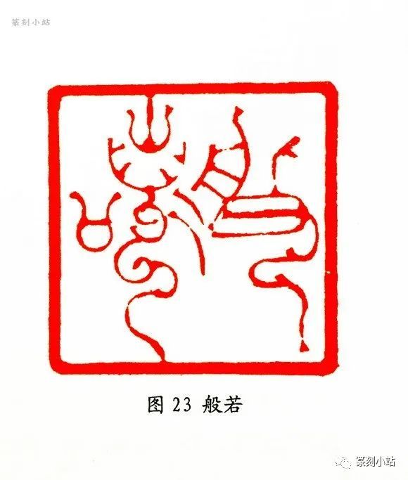 “般若”(图二十三)印,此印为金文的花写法,结合小篆疏放的架构而成,为作者所独造,字态奇崛,“般”字结构变左右结构变斜势之上下错落,“若”字取上收—中放—下收的节奏变律,整体的篆法态势注重聚散与收放,空间因此得到有效释放,作品气宇调畅,神采粲然。