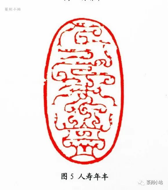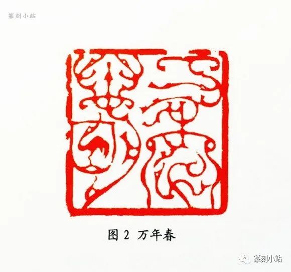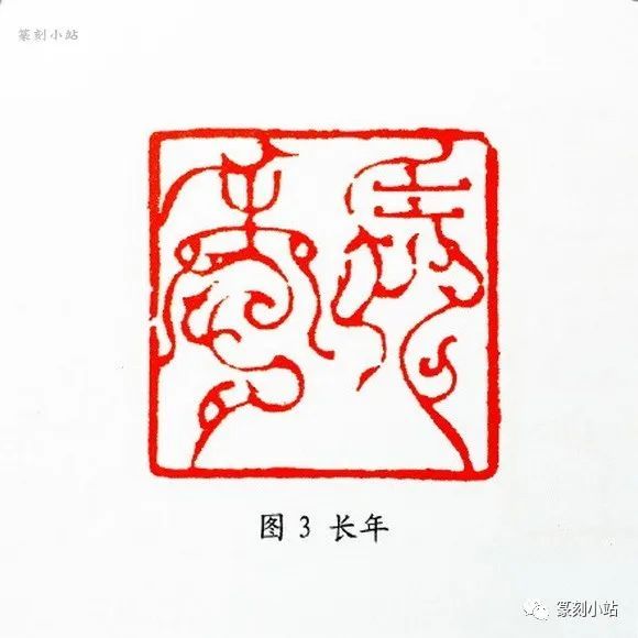 第一种构成方式,以表现鸟虫篆抽象为代表的一路印,是其一个特点。如“万年青”(图二)、“长年”(图三)等印,这类印往往去除动物的具体形质,除了鸟虫头形外,基本上以圆转流畅的线条构成,缭绕迂回,韵律感很强,起收笔多以方折为主,增加线条的含忍之力,富有弹性,刚柔相济,也有部分仿鸟尾收于尖笔。这部分作品的篆法架构基本上是其小篆体势孵化而来,再通过适度的体势夸张,来强化其鸟虫结构的率意和扭动之躯,以体现跌宕奔纵的视觉张力,这路印式因脱胎于其小篆架构,故极具代表性和典型性。
