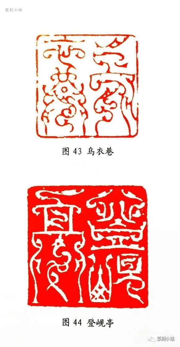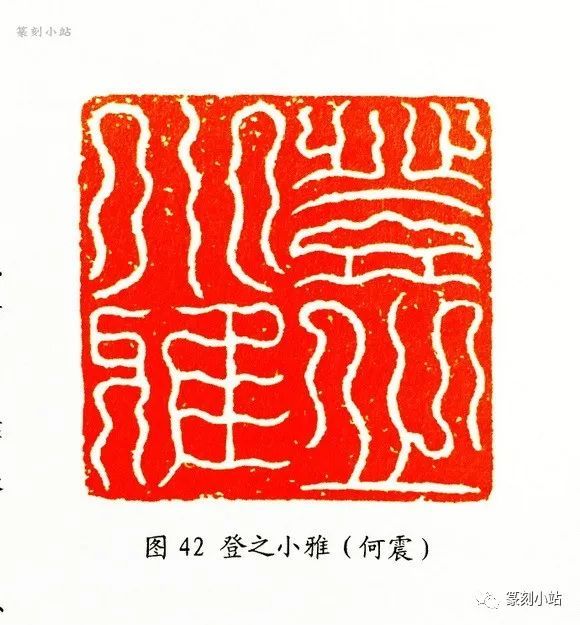我们说鸟虫篆印是篆刻艺术中的一朵奇葩,是因为它有着不同于其他传统印式的文字构成方式,必须仰仗于对文字的美化,对线条和结构施以鸟虫等动物形态的花饰,审美感观是通过作者赋予鸟虫篆多姿多彩,变幻无常的图像来获取,达到心理愉悦和审美享受,它的构成形态决定了其“花哨”的表象,同时也考验作者表达审美趣味上的雅俗之分,毕竟,鸟虫篆印的花哨,或处理不妥,或过度渲染,极易坠入小巧和怪诞的尴尬。明代朱简批何震的“登之小雅”(图四十二)印为“谬印”,倘若不论朱簡认识偏颇,而就此印的气息来说,不仅与传统鸟虫印之比气格相去甚远,即便与何震原本猛烈清刚的风格相比较,也似乎判若两人,无怪朱简会嗤之以鼻,当然,初创的不成熟也是难免的,近现代印家于此也多聊备一格,少有专注者,其理当不言自明,换个角度看,这至少说明了鸟虫篆印在醇雅气息的把握上,还是有一定之难度,光靠胆识,可能是远远不够的,还需要智慧的操控和一定的创作技巧,当然,我们不是唯技法论,追求形而上的东西,但,没有可靠的技法作保证,没有独到的艺心支撑,任何想要表达鸟虫篆印雅而不俗的意境,更不用说想成就独到的面目,恐怕都是比较困难的。