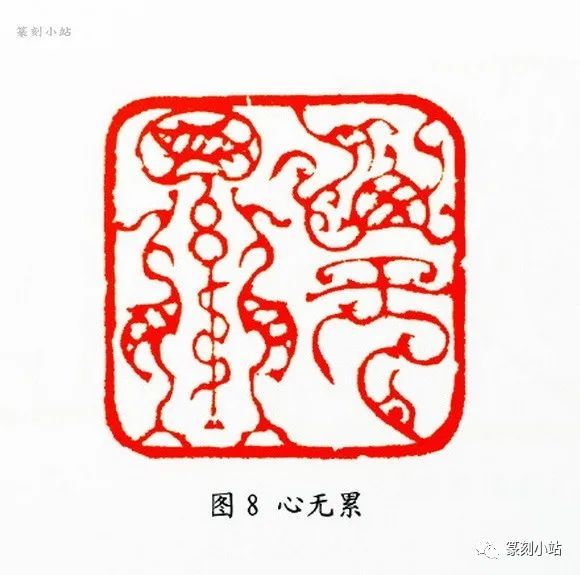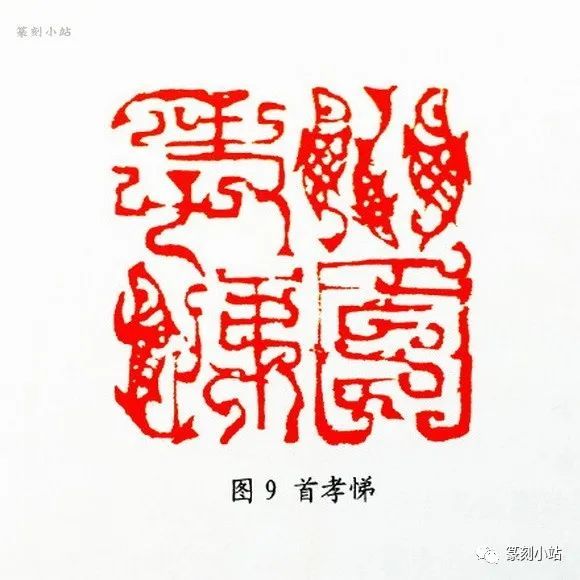 第三种是在具象的图式和抽象的纹饰之间来处理鸟虫篆印的结构变化。如“安康”(图七)、“心无累”(图八)、“首孝悌”(图九)等印均属于这路作品,这类印常根据章法的布白需要,对部分结构施以相对具象的鸟虫图式,甚至强化或放大某个部位的动物如鸟头鱼身或虫姿等图形,通过局部夸张,使结构发生合理的“突变”,增加了鸟虫篆法的可赏性,及章法的奇诡之趣,在纹饰繁简的自然转换与互映中完成对文字的形式美化。