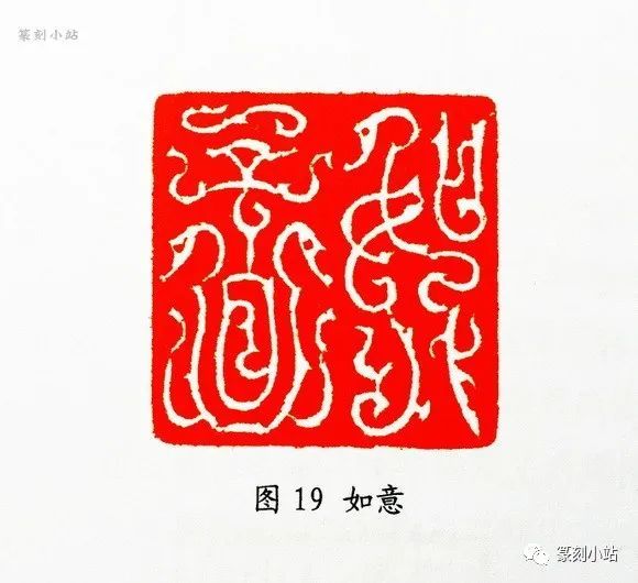 白文鸟虫印的处理手法,基本与朱文相像,统一于一个基调中,“龙吟”(图十八)印为作者近作,与传统白文印相比,自有别调,疏密之趣一目了然,两个字分拆成四个单元,分别置于正—奇—正—奇的节律性构图,章法的空间形态由此打开,加之“笔走龙蛇”般的灵捷纹饰,整个章法疏朗有致,别有风味。即便是诸如“如意”(图十九)印这类满构图的白文作品,作者在处理线条盘曲中的朱白关系上,留出了比朱文线条相对宽敞的空间形态,看似均衡的布白,实是通过朱白对比与互衬,突出了红底的视觉冲击,起到了“计白当黑”的空间支撑。