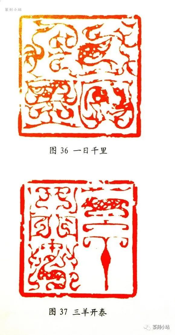 他的鸟虫图式,除了一部分创造性的借鉴传统以外,大部分直接或间接取自于他的花鸟画中的一些鸟鱼形态。从其作品中看到,他十分注重鸟虫鱼等动物的构成形象,或简、或繁、或奇幻、或诡异,姿态清琦浪漫,曲尽其妙,根据章法需要和构成中的疏密要求,采取不同的的“物象加工”手段。如“鱼水情”印,作者借鱼抒情,着力表达鱼在水中的欢悦状态,四条鱼的形状各有意趣,生机勃然,有着似民间剪纸般的朴素质感和趣味,读来饶有意趣。“一日千里”(图三十六)将印从“画”出的纹饰语言发挥到了极致,穷形尽象地刻画了不同动物的姿态,通过惟妙惟肖、意状飞动的肢体语言,将鸟虫篆法的无尽变化演绎得栩栩如生,既没有破坏篆法的准确性与合理性,又极富画意,自出机杼。近作“三阳开泰”(图三十七)印中“三”字中间一横用羊肖形取代,将图形巧妙地融合于篆法之中,与内容相协调,自然中赋予新意。其花鸟等动物的造型和与篆法的互融看似信手拈来,实际上凝聚着韩天衡先生的艺术匠心和丰富的想象力,“这些蜿蜒盘曲、鸟翔夔翱的鸟虫篆,使我们足以把情思的翅膀展开,获得绘画与书法兼而有之的、具象与抽象交融的艺术语言”(韩天衡《秦汉鸟虫篆印章艺术刍议》)。过去传统印章中鸟头虫身的单一图纹或纯以云殳篆式的排叠方法,在韩天衡的刀笔下,有明显的突破和造极之势,特别是他将花鸟画中的鸟鱼之类的造型经印化变形后,移步换影地出现在他的印中,出其不意的的充当了篆法中的某一部首,或某一结构,妙合无垠,艺胆之大非一般印家所能为之,粗看似云里雾里,甚至有点诡谲,细看则有豁然开朗的感觉,令人叹为观之,使人心动。由于他的鸟虫等纹饰多与绘画有密不可分的关系,所以他的印风和画风在整体气息上又有许多惊人的相似之处,也为他的鸟虫篆印创作提供了丰富的、多元化的表现方法,正所谓:戈头矛角殳书体,柳叶游丝鸟虫文,我欲探微通画理,恍如腕底起风云(方介堪语)。
