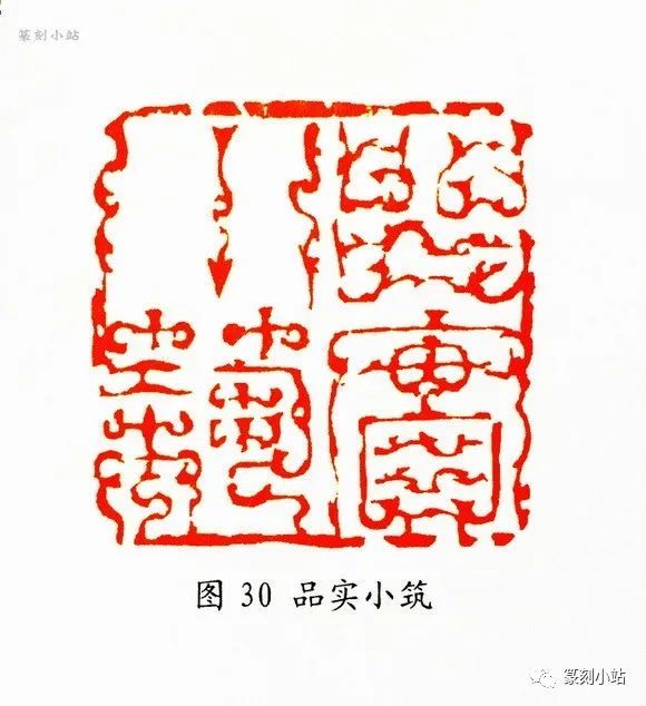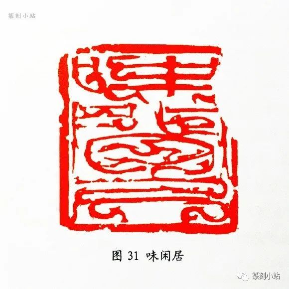 “品实小筑”(图三十)印,为其前几年的作品,用刀冲、切、披兼施,酣畅的用刀中夹带着几许拙意,丝丝入扣,又步步虚实,此作堪称鸟虫篆印中旷绝之作。同为前几年的作品,“味闲居”(图三十一)印则表现了韩印刀法峭拔的另个特点,用刀明快犀利,旨在表现此印恣肆酣畅的特点,跌宕昭彰,沁人肌体,尤其是刊凿中落刀之精准,恣肆奔放的态势在印面上一览无余。