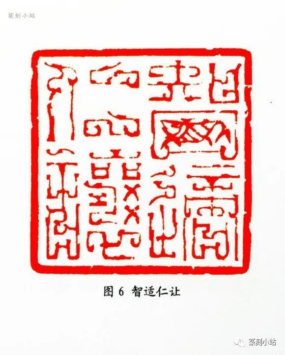 第二种构成方式,如“行者常至”(图四)、“人寿年丰”(图五)、“智适仁让”(图六)等作品,比起第一种较抽象的刻画,这路印的特点是,结构相对方正,内在的笔画盘曲幅度略小,也有淡化结构中的鸟虫等物态的具体形象,相对强化了线条中的鸟虫等动物痕迹,整个线条都处理得很毛感,波磔连绵,似为鸟虫身段,又似青铜凤鸟纹,说清晰又不够具象,言不清又似乎存在,变幻莫测,这似与不似中,在于用刀有顿挫,有轻重,也有虚实,故丰富了鸟虫纹饰在线形上的可看性,成为其代表韩式鸟虫篆印标志性样式,这种原创性的作法也为当今的鸟虫印创作提供了可参照的表现语素。