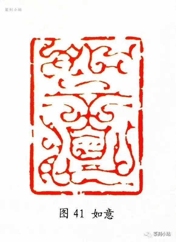 “如意”(图四十一)印,吉祥语,受印者多喜之,故韩天衡先生也刻过不下数十方,每方都迥异别样,一印一腔,一印一景,各有风貌,所载这方拟稿多达二十余枚,可称惨淡经营。此印在完善细节上注重一个“姣”字,线条纹饰之姣,篆法形态之姣,故下刀时的精准如游丝般细微,我们以为,以凭韩天衡对鸟虫篆印的驾轻就熟,大可不必于此“斤斤计较”,即便一蹴而就,也能手到擒来,然而,韩天衡的可贵之处,是他对篆刻创作素来有着推三究四的较真秉性,足见其对待创作的态度之谨严,之真切,才有如此这般“折腾”,也直射出了他对传统艺术的敬畏之心和崇尚完美的治艺思想。