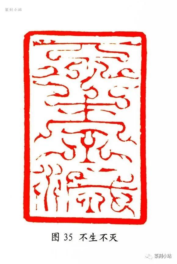 尤为叹服的是,近年来韩天衡的用刀进入了一个神妙无似的境地,在很多情况下,他在表现刀意上,是不遗余力的,在实践中不断修正,又不断丰厚个人的刀法语言,最大限度的去表现刀法在辅助和建构具有个人强烈面目的印风中担纲的重要角色。“舍利子”(图三十三)印和“蒸蒸日上”(图三十四)印均为韩天衡先生这两年的作品,其用刀精熟,如游刃于无人之境,他所推崇晚晴让翁用刀之神游太虚,经常复现于他的作品里,看似一种形式上的秉承,实际上承传中融入了他自己的运刀心路。前者运刀如天马行空,线条虚幻,若隐若现,空灵而疏放;后者刀法劲健,以披削为主,游刃恢恢,将鸟虫姿态表现得神采飞扬,极富想象力。“不生不灭”(图三十五)印中,作者以其擅长的长冲刀法为主,施刀如笔,加之披削相糅,线条似行云流水,起伏生韵,虚实自如,赋予节律般之韵味。