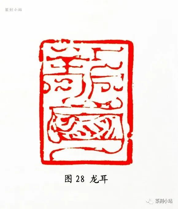 在汉篆入印的古印中,朱白相间的形式多能见之,而在鸟虫篆印中却非常稀少,前贤更无此作法,今人也少有创意,这看似一个布局上的小小变化,在韩天衡的“用心”下,这种形式的表现力度被有意味的强化了。朱文线条通过白文块面的介入,一方面丰富了鸟虫篆印的表现语言,另方面拓展了其结构的形态变化,在不悖篆法的前提下,朱白间变幻所产生的视觉错落感,使印面的黑白关系增添了一番异样情趣。“鱼乐斋”(图二十六)印中,作者分别在三字的中间部分均以白文图式镶入,章法顿生实中见虚、繁中有简之趣,朱白相生,曲尽其妙。这种整体字形中的某一结构或部首作反向的对比处理,韩天衡称之为“局部隐性嵌入法”,这种嵌入的图式也不是一成不变的,而依据整体线形的不同作区别对待, “如意”(图二十七)印之“意”与“龙耳”(图二十八)印之“耳”字,同为一法,又有所区别,前者线条流转,动感极强,故“意”字取龙肖形,盘旋缭绕,朱白相容。后者“龙”字嵌入鱼形,姿态方折,吻合了柔中带刚的朱文线形,同样咀嚼有味。在形式的探索中,韩天衡先生用他的智慧,巧妙而生动地丰富了鸟虫篆印结构的容变度,最大限度地诠释了鸟虫篆印特有的艺术观赏性,此类印式成为其作品中很有别趣和新意的一道风景。