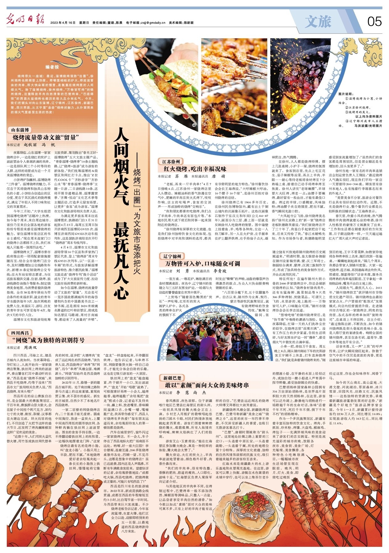 编者按:烧烤带火一座城!最近,淄博烧烤强势“出圈”,徐州烧烤也频频登上热搜。那噼里啪啦的炉火,那滋滋冒油的肉串,那大快朵颐的惬意,是氤氲在烧烤里的人间烟火气。除了淄博烧烤、徐州烧烤,“万物皆可烤”的锦州烧烤,注重释放羊肉自然清香的巴楚烤串,“巴适得很”的西昌火盆烧烤也都历史悠久且小有名气。今天,我们把镜头对向山东淄博、辽宁锦州、江苏徐州、新疆巴楚、四川西昌,从文字里“品尝”烧烤的魅力,从扑面而来的烟火气里感受生活的热度!
