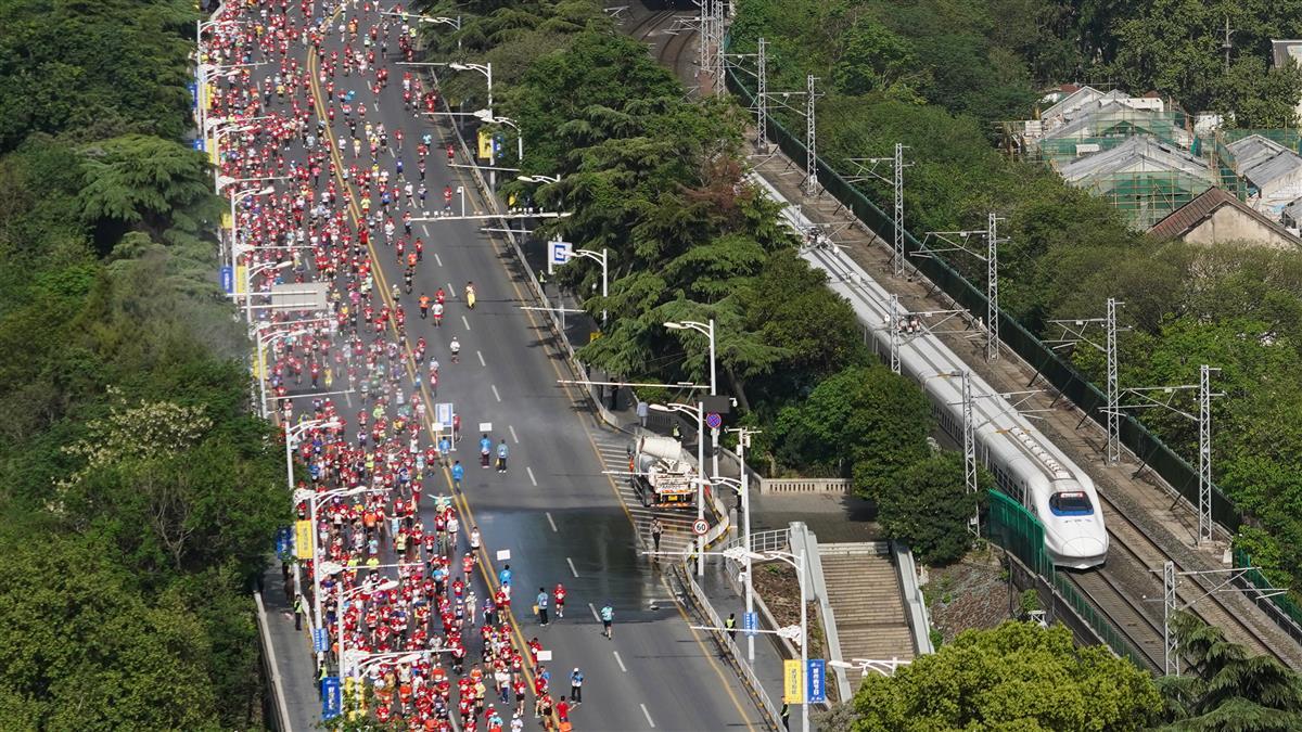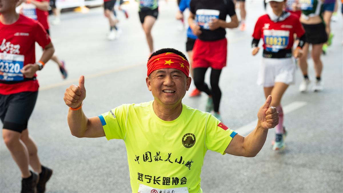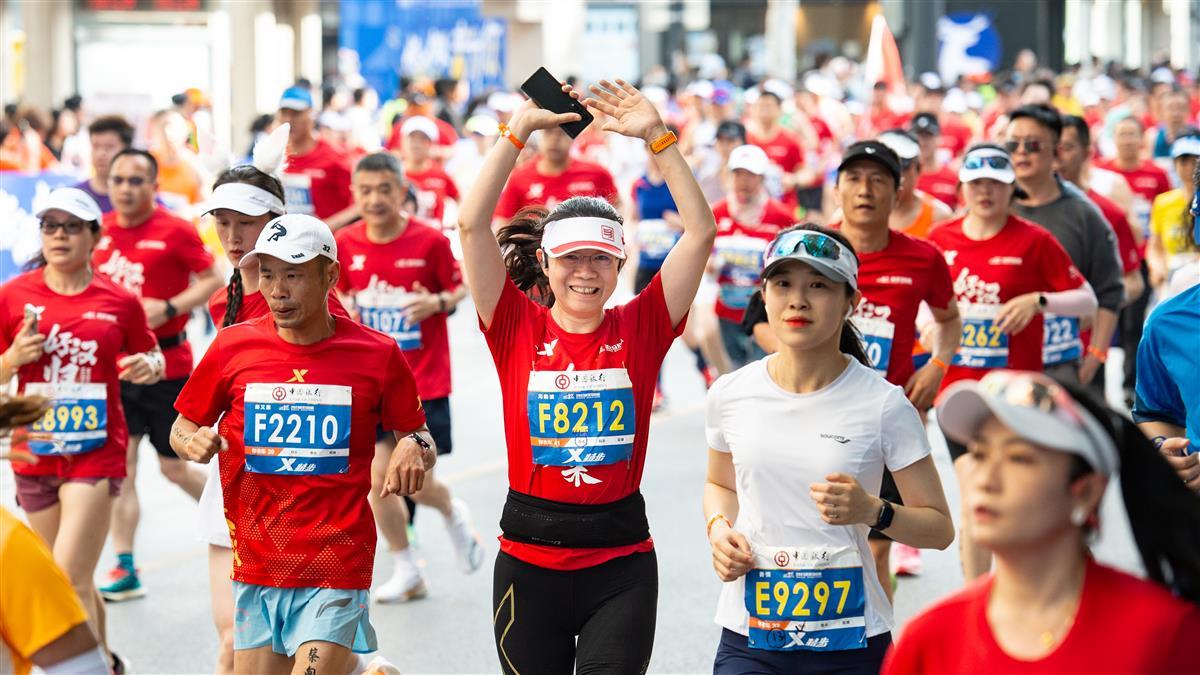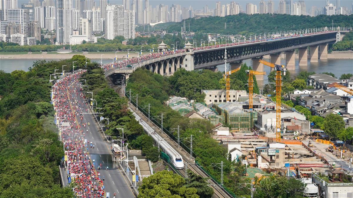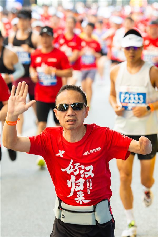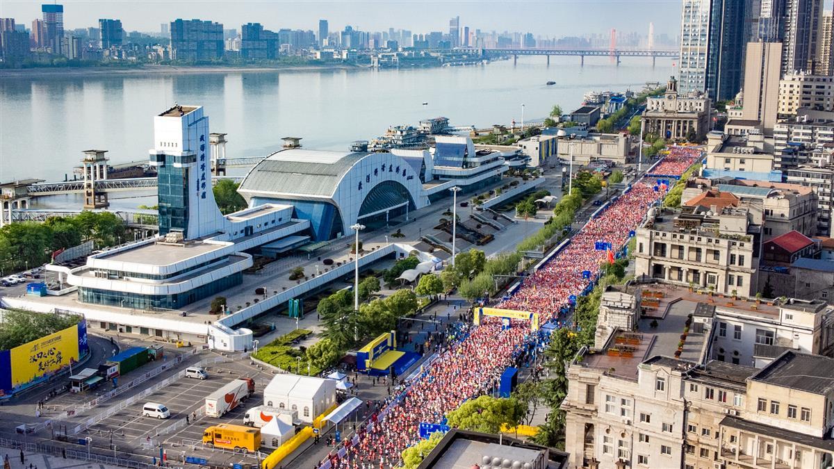 2023年4月16日7时30分,2023武汉马拉松鸣枪开跑,时隔4年,武汉马拉松再度回归,选手们从沿江大道武汉科技馆前开跑,现场人气爆棚,不少市民游客在沿途为选手鼓劲加油,迎接“好汉归来”。(湖北日报全媒记者何宇欣 实习生刘昊博 摄)