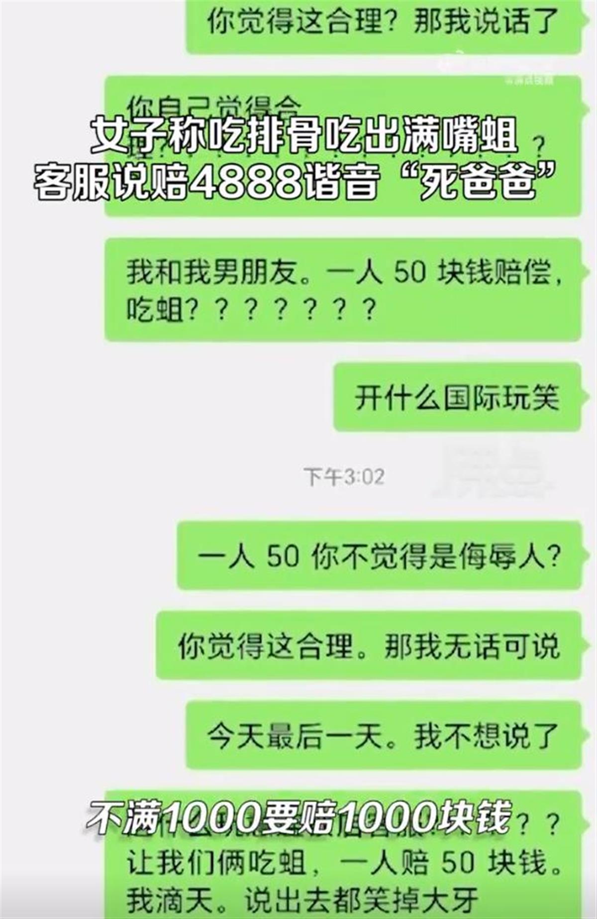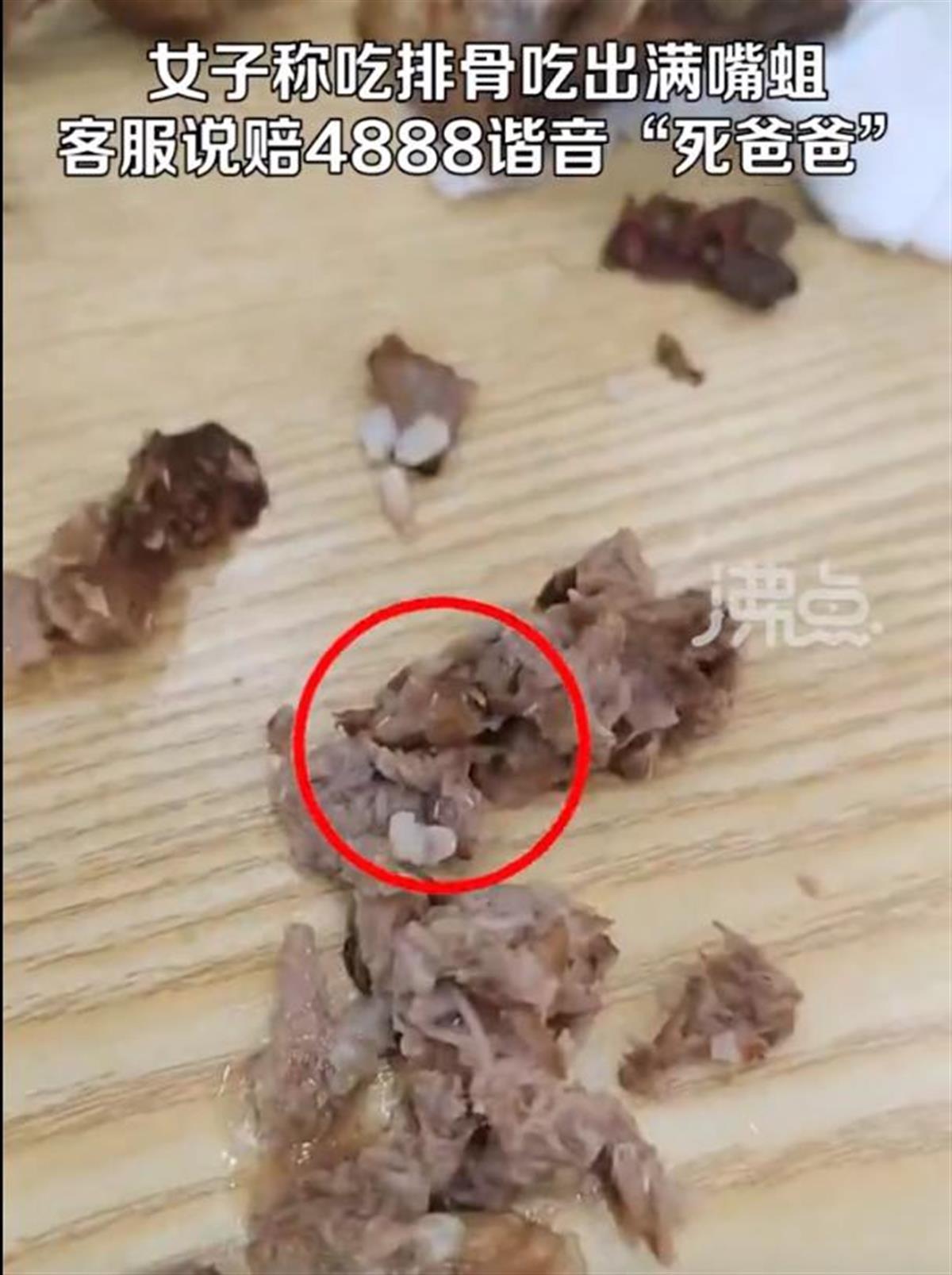 4月14日,安徽合肥,女子跟男朋友在黄蜀郎鸡公煲一门店就餐,已经吃了一部分才发现排骨里都是蛆。她向老板反映后,老板称这个品牌是连锁的,在全国有上千家店,不是自己的问题,是供应商的问题,供应商只同意退款并赔偿100元,自己不接受,拨打了12315投诉并将视频发到网上。(据4月17日北晚在线)