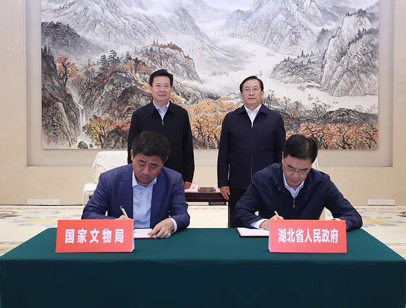 4月17日下午,湖北省政府与国家文物局签署共同推进湖北文物事业高质量发展战略合作协议。省委副书记、省长王忠林,文化和旅游部副部长、国家文物局局长李群见证签约,并于签约前座谈交流。