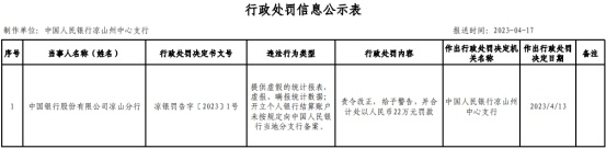 中国经济网北京4月18日讯 中国人民银行网站昨日发布行政处罚信息公示表(凉银罚告字〔2023〕1号),中国银行股份有限公司凉山分行存在提供虚假的统计报表,虚报、瞒报统计数据;开立个人银行结算账户未按规定向中国人民银行当地分支行备案的违法行为类型,中国人民银行凉山州中心支行于2023年4月13日对其作出责令改正,给予警告,并合计处以人民币22万元罚款的行政处罚。