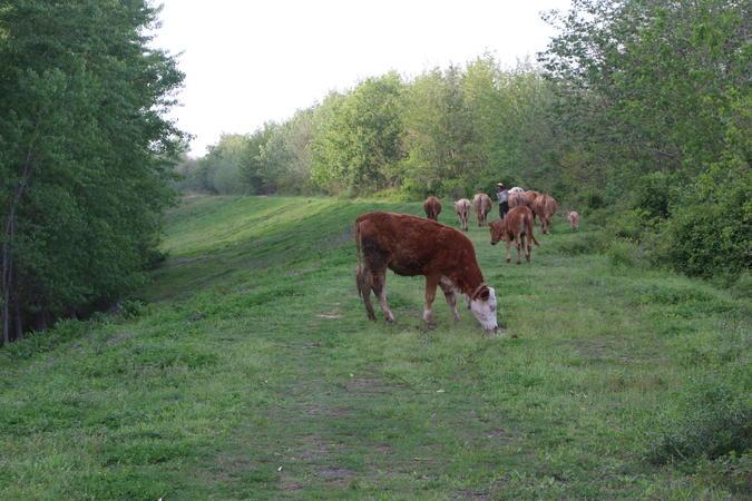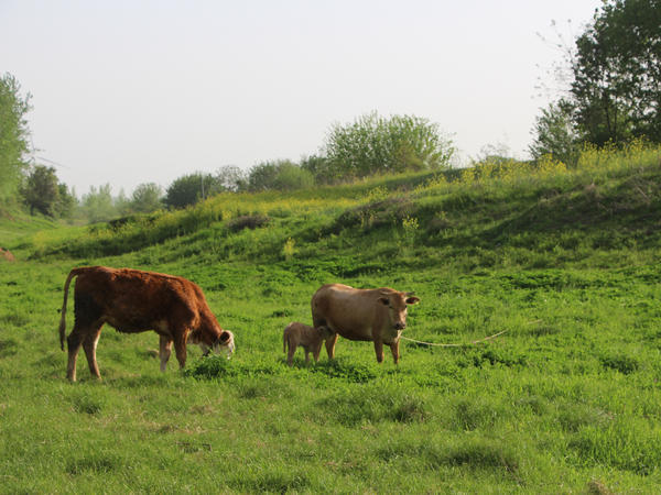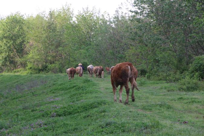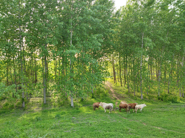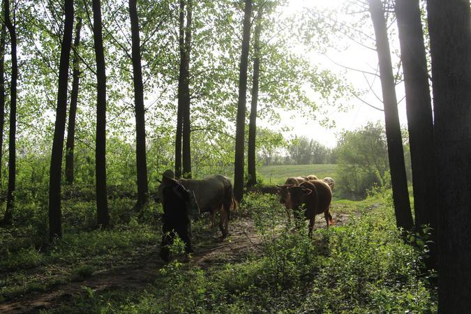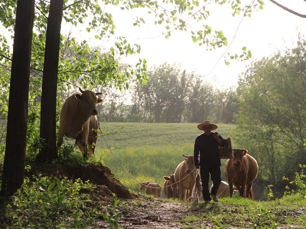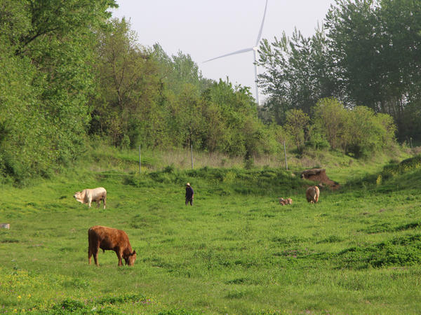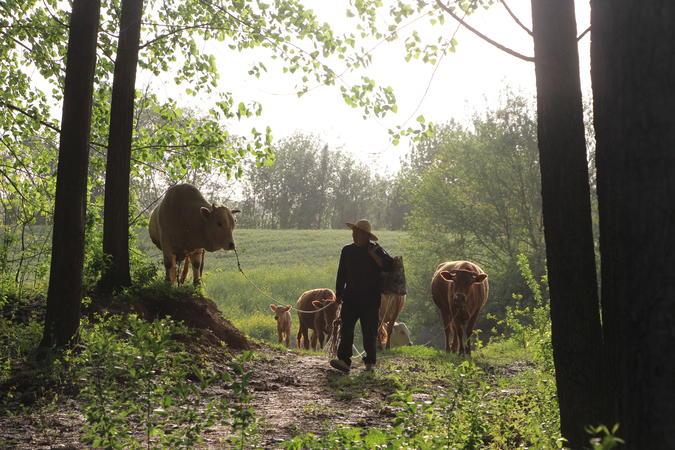 绿树、青草、蓝天、白云,红花、黄花、夕阳,草甸、河流、风电、远山,黄牛、白牛、小牛犊,农民在最美人间四月天放牧归来,成为乡村一道独特的风景。